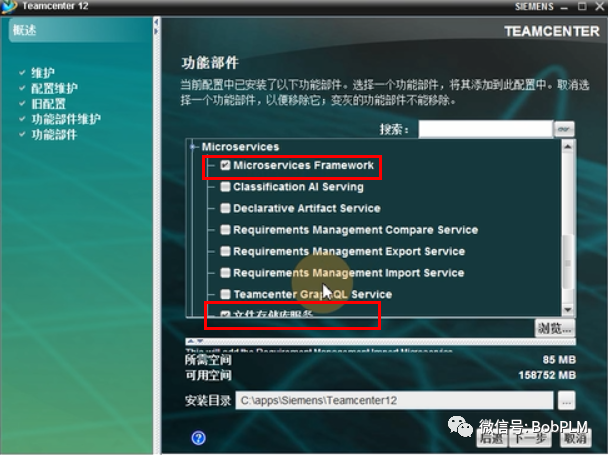 选择组件:"Microservices Framework"、"文件存储服务",点击"下一步"
