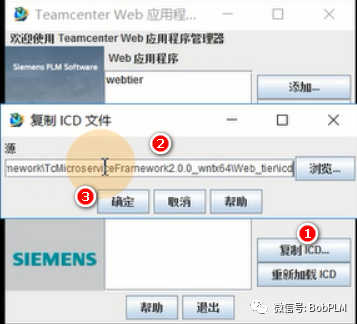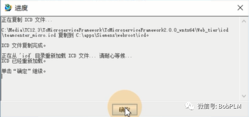 点击“复制ICD...”,在弹出的“复制ICD文件”对话框中浏览到TcMircoserviceFramework介质下的Web_tier\icd路径(路径类似:C:\Media\TC12.3\TcMicroserviceFramework\TcMicroserviceFramework2.0.0_wntx64\Web_tier\icd),点击“确认”,在复制完成后点击“进度”对话框中的“确定”