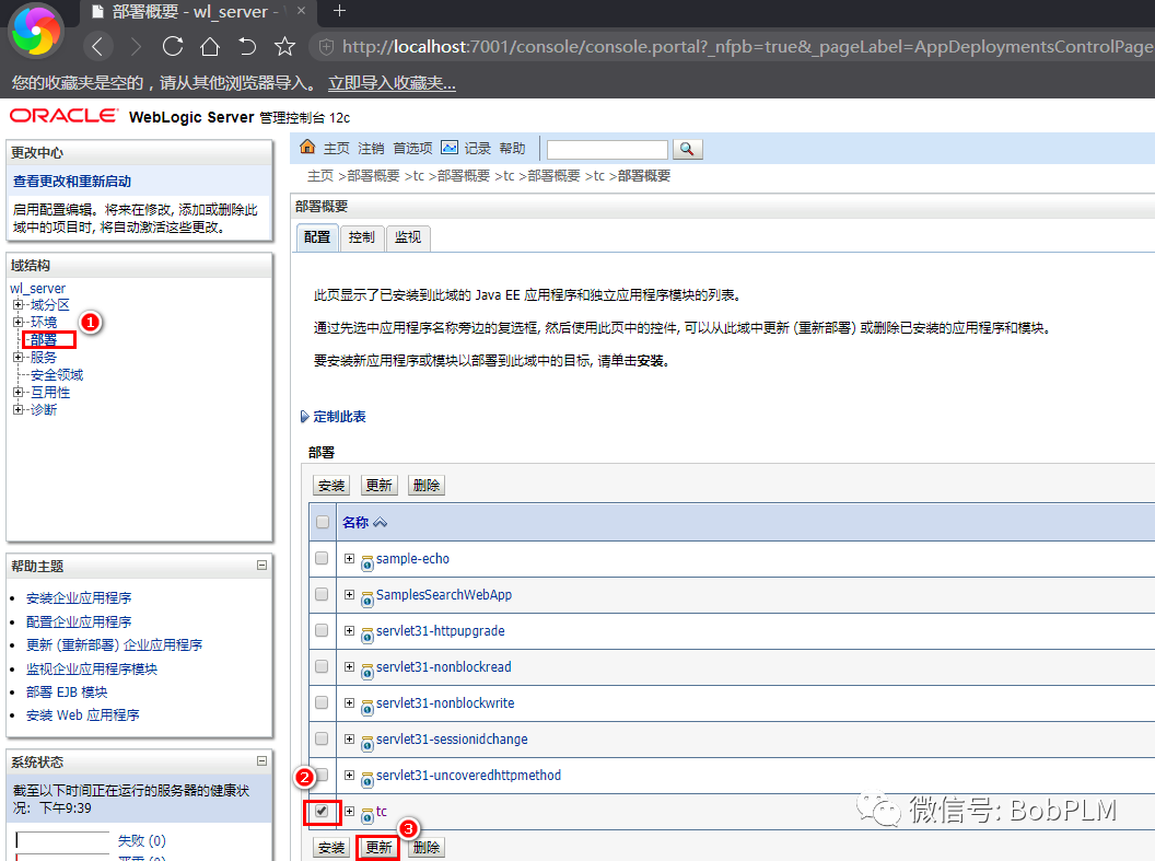 8.7.4.5.1 Weblogic控制台中,点击“部署”,勾选“tc”应用,点击“更新”按钮