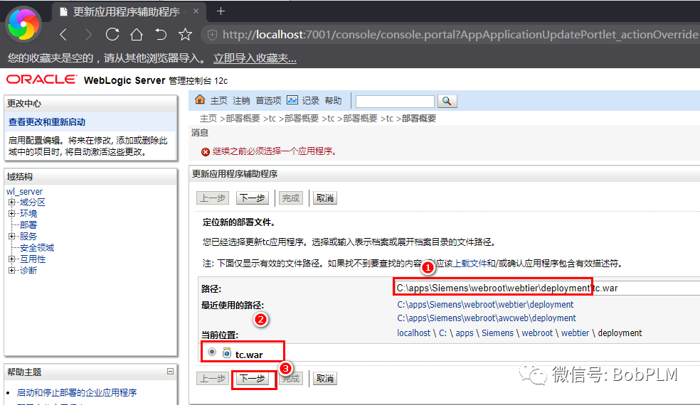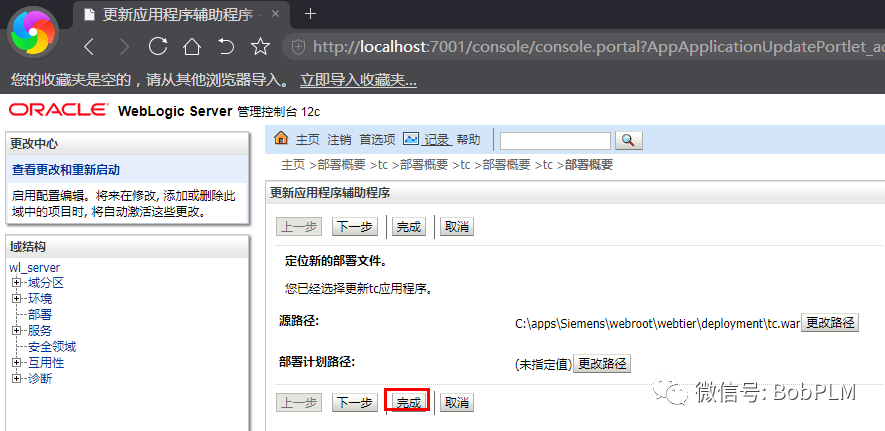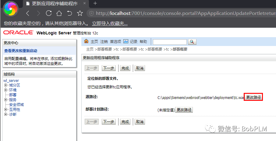 点击“更改路径”按钮,修改路径为刚刚生成的awcweb路径里的tc.war路径(如:C:\apps\Siemens\webroot\awcweb\deployment),后勾选tc.war,点击“下一步”后再点击“完成”
