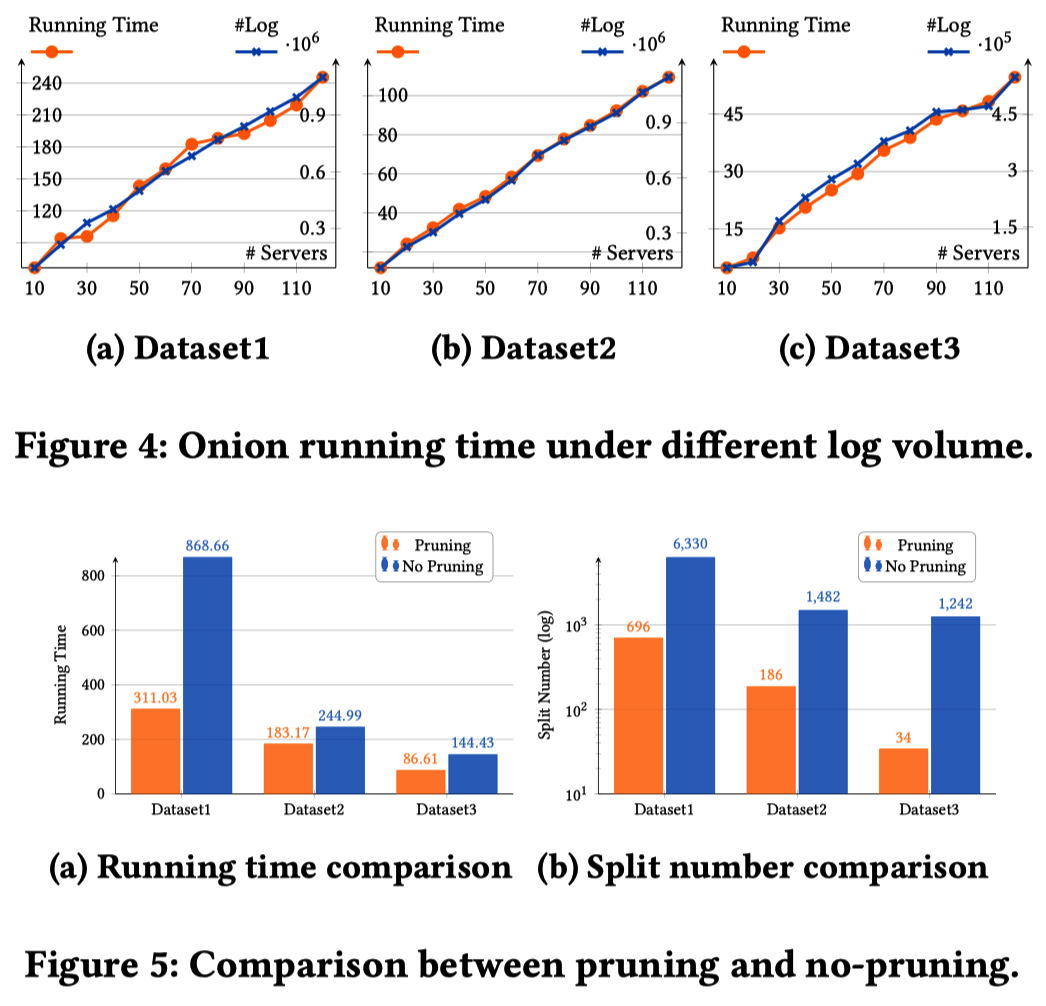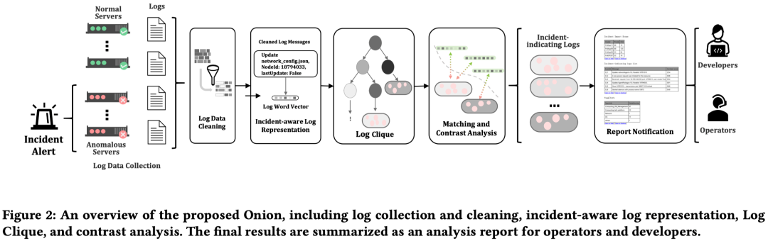 论文中提出一种自动化解决方案 「Onion」 来精确高效地定位故障日志,首先指出定位故障日志的三个标准:一致性、影响性、双向差异,然后提出一种新颖的日志聚合方法 「log clique」 可以同时满足这三种标准。为了得到 log clique 论文中提出了一种事件感知的 log 表示和聚类技术,然后对 clique 进行对比分析来识别事件日志。实验部分在标注好的日志数据集中验证了 Onion 的性能,可以达到 0.95 F1-score 并且可以在分钟级内处理百万条日志,应用在真实场景微软云系统中已定性定量证实 Onion 的有效性。