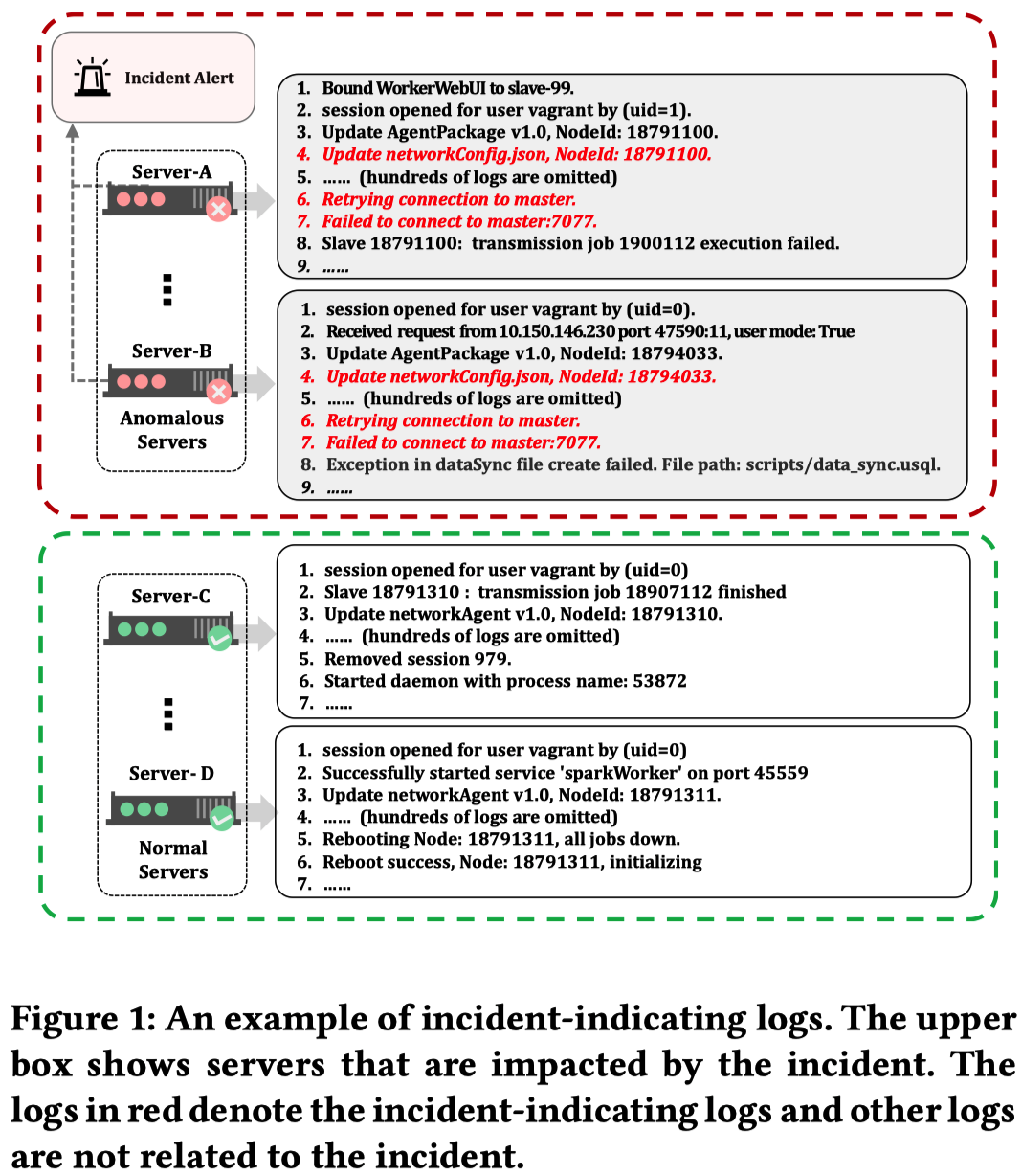 「incident-indicating logs」:指受事件影响的不同服务器日志其所描述的是同一系统事件。如下图所示