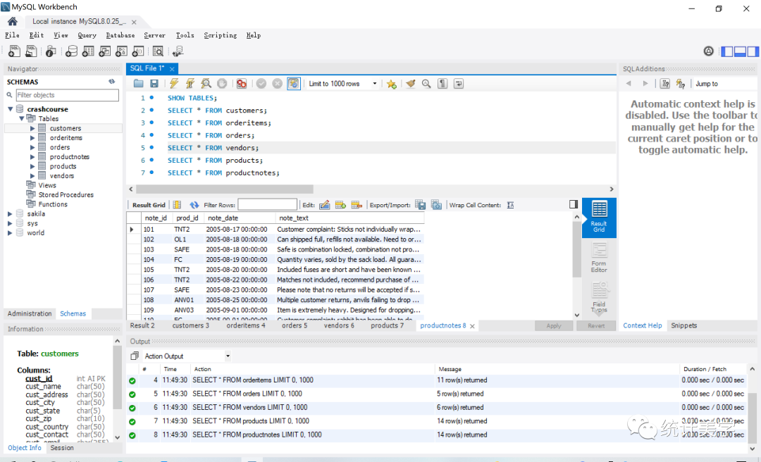 左下方【Information】:信息窗格,显示当前对象梗概,图示显示的是表[customers】的字段信息;