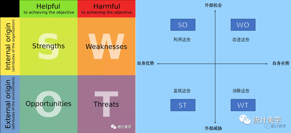 SWOT分析法基于内外部竞争环境和竞争条件,将与研究对象密切相关的各种主要内部优势、劣势和外部的机会、威胁等,通过调查列举出来,并依照矩阵形式排列(如上如所示),然后用系统分析(即整体分析)的思想,把各种因素相互匹配起来加以分析,从中得出一系列相应的结论,而结论通常带有一定的决策性。其中,S(strengths)是优势、W (weaknesses)是劣势、O (opportunities)是机会、T (threats)是威胁。SWOT分析法可以对研究对象所处环境进行全面、系统、准确的分析,从而根据分析结果制定相应的发展战略、计划以及对策等。