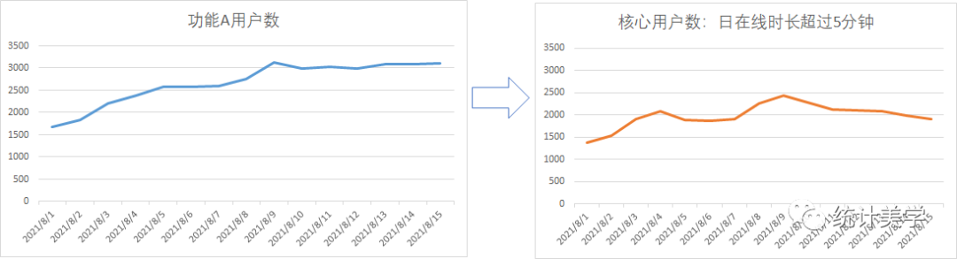 功能A的用户数看起来是在不断增加,但是核心用户数是在不断下降的