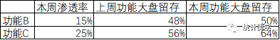 功能C对大盘周留存提升贡献度:25%*(64%-56%)=2%