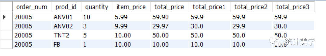 -- round(), truncate(), format()USE crashcourse;SELECT order_num, prod_id, quantity, item_price,item_price*quantity AS total_price,round(item_price*quantity, 1) AS total_price1,truncate(item_price*quantity, 1) AS total_price2,format(item_price*quantity, 1) AS total_price3FROM orderitemsWHERE order_num = 20005;