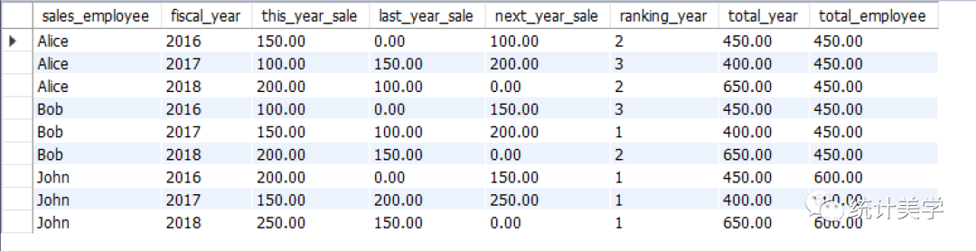 -- lag(), lead(), rank(), sum()...SELECT sales_employee, fiscal_year, sale AS 'this_year_sale',lag(sale, 1, 0) over(partition by sales_employee order by fiscal_year) AS 'last_year_sale',lead(sale, 1, 0) over(partition by sales_employee order by fiscal_year) AS 'next_year_sale',Rank() Over(partition by fiscal_year order by sale desc) AS 'ranking_year',sum(sale) over(partition by fiscal_year) AS 'total_year',sum(sale) over(partition by sales_employee) AS 'total_employee'FROM sales;