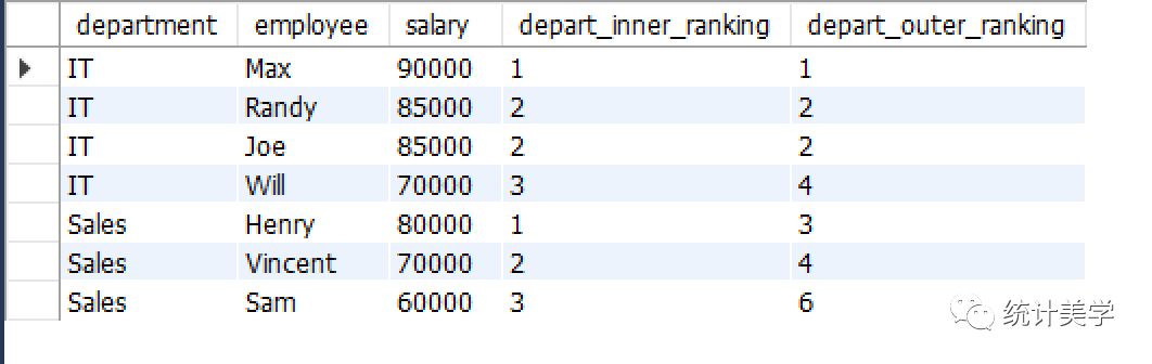 -- 查询每个部门工资前三的员工-- 临时表创建方式1:在FROM子句中用AS关键字封装结果集为临时表,适用于简单查询SELECT department, employee, salary, depart_inner_ranking, depart_outer_rankingFROM(SELECT department.name AS 'department',employee.name AS 'employee',employee.salary AS 'salary',Dense_Rank() Over(PARTITION BY departmentid ORDER BY salary DESC) AS 'depart_inner_ranking',dense_rank() over(ORDER BY salary DESC) AS 'depart_outer_ranking'FROM employee INNER JOIN department ON employee.departmentid = department.id) AS temp_tableWHERE depart_inner_ranking <= 3ORDER BY department ASC, salary DESC;-- 临时表创建方式2(推荐):用WITH...AS()建立临时视图,适用于复杂查询WITH temp_table AS(SELECT department.name AS 'department',employee.name AS 'employee',employee.salary AS 'salary',Dense_Rank() Over(PARTITION BY departmentid ORDER BY salary DESC) AS 'depart_inner_ranking',Dense_Rank() over(ORDER BY salary DESC) AS 'depart_outer_ranking'FROM employee INNER JOIN department ON employee.departmentid = department.id) -- 用WITH封装起来的临时表类似于临时视图SELECT department, employee, salary, depart_inner_ranking, depart_outer_rankingFROM temp_tableWHERE depart_inner_ranking <= 3ORDER BY department ASC, salary DESC;