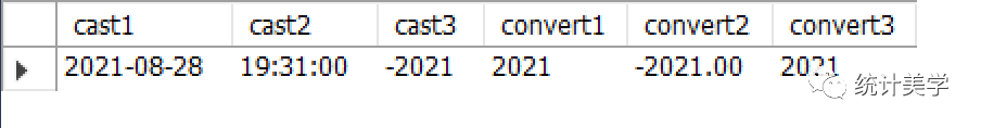 -- CAST(value AS type), convert(value, type)-- type支持的数据类型包括:-- BINARY, CHAR(), DATE, TIME, DATETIME, DECIMAL-- 整型 SIGNED, 无符号整型 UNSIGNEDSELECT CAST('2021-08-28 19:31:00' AS date) AS 'cast1',CAST('2021-08-28 19:31:00' AS time) AS 'cast2',CAST('-2021' AS signed) AS 'cast3',convert('2021', unsigned) AS 'convert1',convert('-2021', decimal(10,2)) AS 'convert2',convert(2021, char(4)) AS 'convert3';