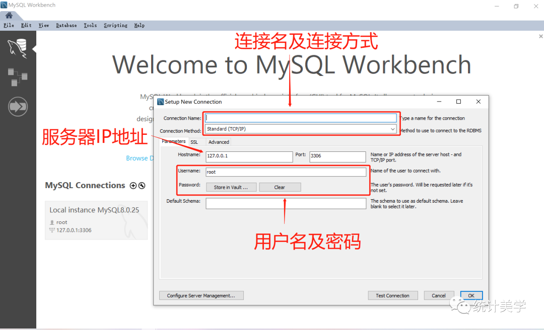 安装并打开workbench,建立客户端与服务器之间的连接,需要给该连接命名并选择连接方式(默认选择TCP/IP方式进行连接,也就是通过网络连接到服务器),还需要指定服务器的IP地址(本机地址为127.0.0.1),用于唯一确定服务器在网络中的位置,再填写数据库用户名及密码即可,创建完成后,以后便可以直接通过该连接访问MySQL服务器: