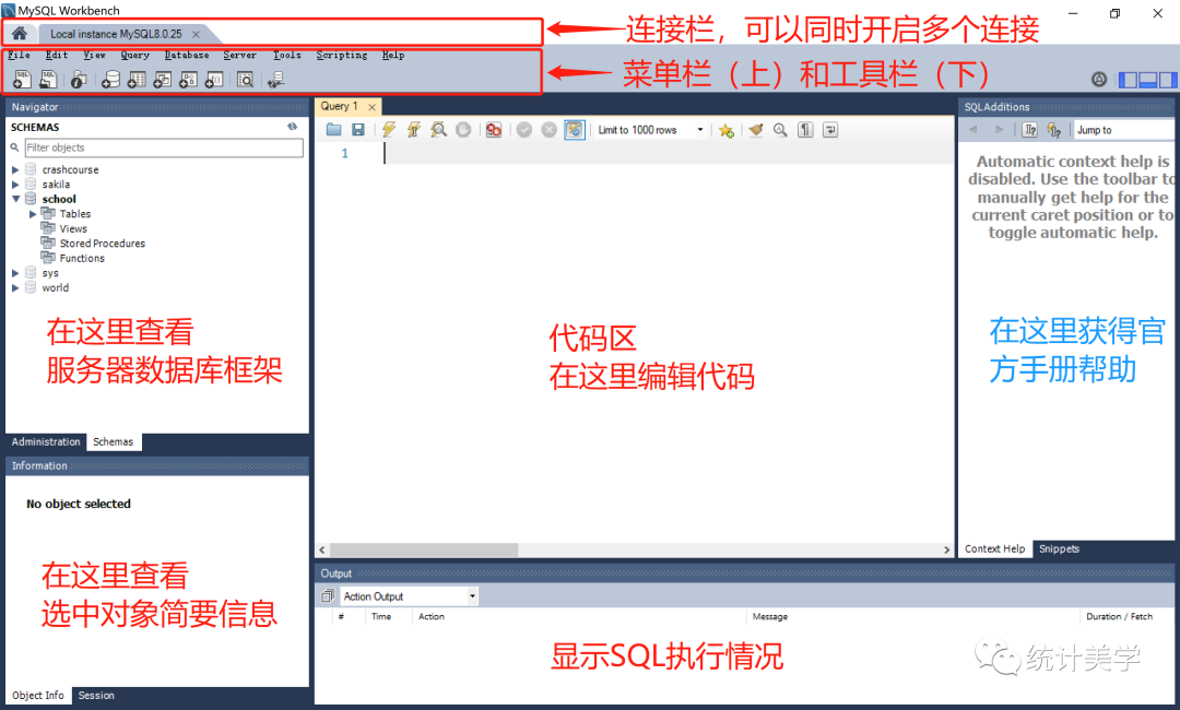 点击连接后进入到workbench主界面,主要包括:导航栏、信息栏、帮助栏和代码区,Output区可以查看命令是否执行成功及错误调试信息,左右侧边栏及output区都可以按需求选择显示/隐藏,只需要点击右上角的区域符即可,其它还包括: