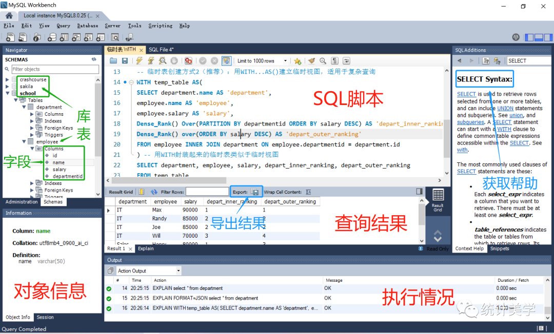 结果窗格Result Grid除了能查看、编辑检索结果外,还可以查看查询统计信息Query Statistics,这里显示了该SELECT语句执行用时等具体细节: