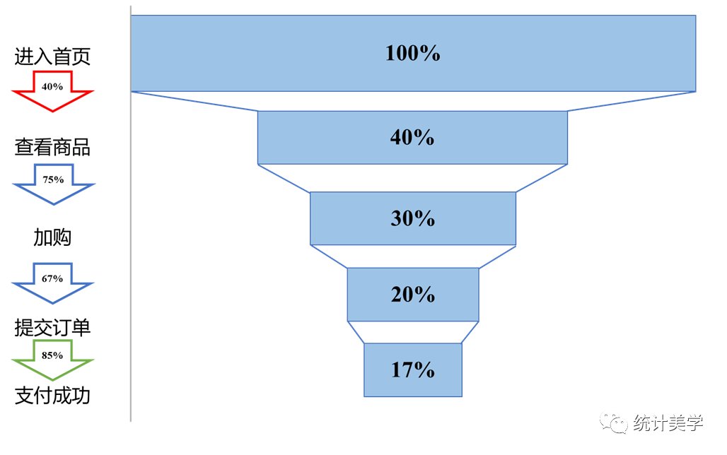 例如:某新上线的购物APP每日浏览人群中,只有17%的人转化消费成功,这意味着每100个访客中有83人最终流失掉了。在用户使用该APP的过程中,大概会经历点击首页、查看商品页、加购、进入支付页面、支付成功等步骤。