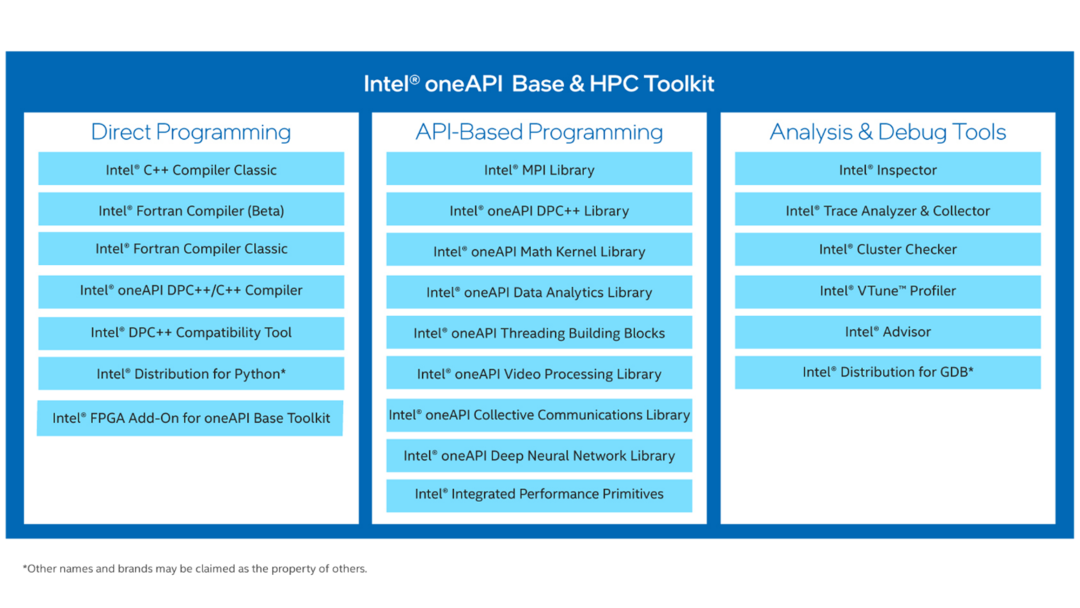 英特尔® oneAPI Base & HPC Toolkit,作为英特尔® Parallel Studio XE的升级版本, 是可以实现上述要求的核心开发工具套件 (参考: https://software.intel.com/oneapi ). 它有助于实现基础设施层面的算力优化,内置最新的矢量化、多线程、多节点和内存优化技术,能尽力释放最新英特尔处理器、平台以及集成硬件的出色性能和功能优势。英特尔® oneAPI Base & HPC Toolkit 提供了集成开发环境和开发工具套件,帮助开发人员拥有强大、一致的编程体验,同时可使用 C、C++、Fortran 和 Python 等多种语言编写更快的并行代码,并基于多线程、多进程发现隐藏问题并解决问题,适合用来开发企业、云端、HPC和AI解决方案[5]。