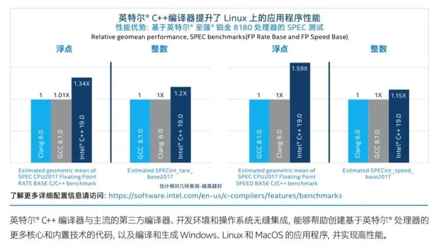 为了实现基础设施算力优化,英特尔® oneAPI Base & HPC Toolkit 还集成了英特尔® C++ 编译器。在英特尔至强处理器平台上,用它编译、构建的 Linux 应用,比其他编译器性能可最高提升 60%[6]。同时,英特尔® C++ 编译器还可与主流第三方编译器、开发环境和操作系统无缝集成,编译生成高性能Windows、Linux 和 MacOS 应用。