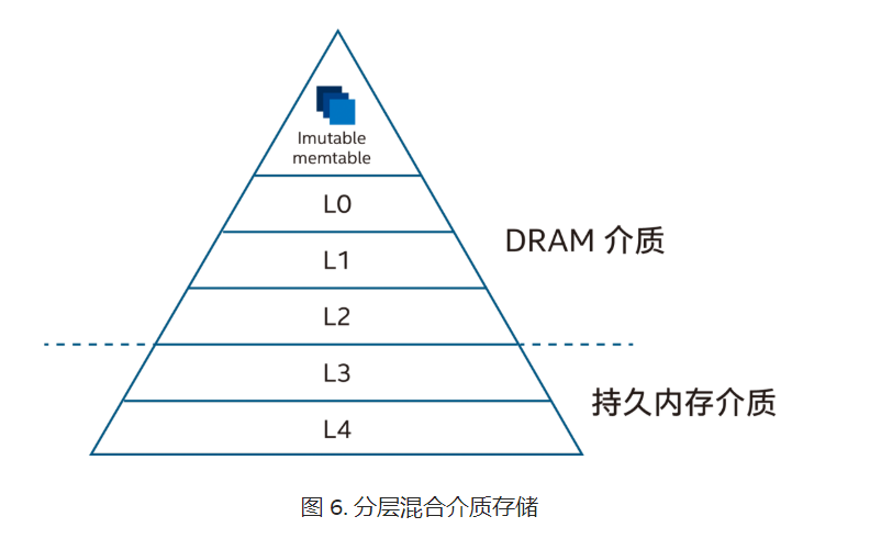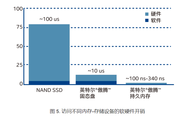 以火山引擎推荐系统 IndexService 目前承载的某项服务为例,它目前在晚高峰时期的总 TPS 可达到读 7000 万,写 3000 万;总 KPS 可达到读 30 亿,写 2.7 亿。如此大规模的访问量不仅需要足够大的存储容量来支撑,也需要快速高效的数据访问和处理能力。为满足该服务的性能需求,火山引擎在使用英特尔® 傲腾™ 持久内存时将其配置为 App Direct 模式。在该模式下,持久内存通过内存总线直接连接到处理器,应用程序可以绕过操作系统,无需驱动程序、系统调用、中断和上下文切换就能从用户空间直接访问持久内存上的数据,因此,系统几乎没有软件开销。如图 5 所示,在这种情况下,英特尔® 傲腾™ 持久内存的时延约为 100 ns-300 ns,不仅遥遥领先于 SSD,更是具有接近 DRAM 内存的性能5,可以很好地满足高峰期间对数据访问速度的需求。