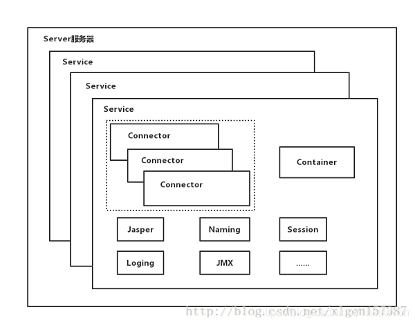 Tomcat中只有一个Server,一个Server可以有多个Service,一个Service可以有多个Connector和一个Container;