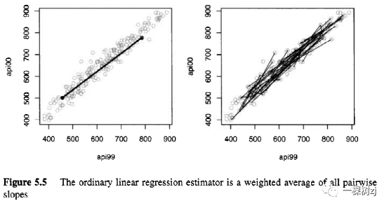 如果我们从一个简单的随机样本中得到 n 个点,那么就有 n(n - 1)/2 个这样的点对,所以我们可以计算 n(n - 1)/2 个不同的斜率,其中 βj, j 是直线的斜率在 (xi,yi) 和 (Xj,yj) 之间。图 5.5 显示了 50 条这样的线。这些估计值可以通过对它们求平均来组合,但是当 xi - x j 很大时会有更多信息,因此我们更喜欢加权平均。在图 5.5 中很明显,短线比长线具有更多的可变斜率。如果我们使用权重 W i j = (xj- X j ) 2 加权平均值将是