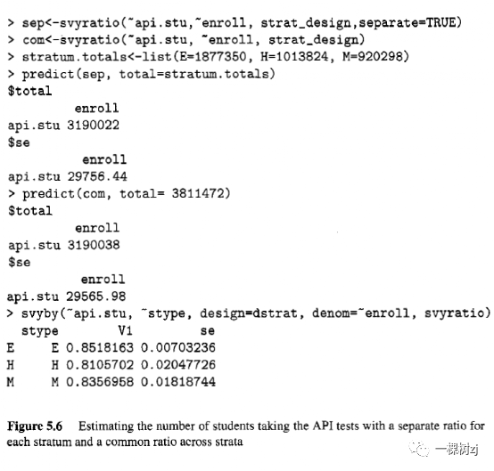 其中,βk 是层 k 的比率。在大样本量中,单独的比率估计量将比基于单一比率的估计量更准确,因为它使用更多的总体信息并且因为更多的估计参数允许工作模型更好地拟合数据。在第 5.1.3 节的示例中,单独比率模型的估计值和标准误与单一比率的估计值和标准误差几乎相同,因为参加 API 测试的学生比例在小学、中学和高中之间没有明显差异学校。图 5.6 显示了单独比率估算器的计算,以及学校类型之间的比率比较。