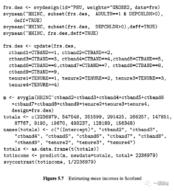 总体总数可用于两个分类变量,即议会税收范围 (CTBAND) 和住房使用权 (TENURE),即人们是私人租房、从政府租房、拥有房屋或抵押房屋。图 5.7 定义了每个类别的指标变量,然后拟合线性模型并预测家庭总收入。可以将总数除以苏格兰的家庭数 (2236979) 以获得平均值。必须手动定义指标变量而不是使用 R 的类别自动处理的原因是 predict()函数需要单行数据来预测总数,因此需要为每个指标变量。