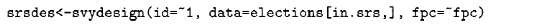 数据集中有 3049 个地区(县或州),巴拉克奥巴马的总票数为 65627076,约翰麦凯恩的总票数为 57545471。如果我们抽取 200 个地区的简单随机样本,我们可以通过以下方式定义调查设计对象