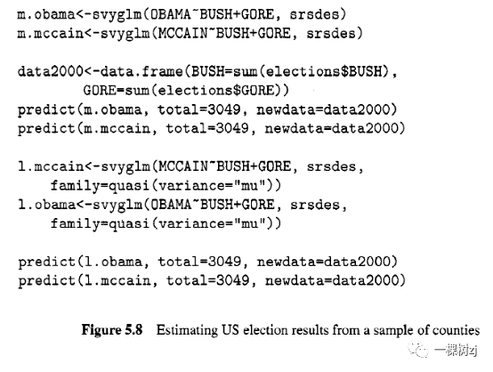 工作线性模型在回归线周围具有恒定的方差,但我们预计更大的区域会有更多的可变性。我们可以拟合一个工作模型,其中回归线周围的方差与拟合值成正比,因此有效地与该区域的投票数成正比。图 5.8 中的第三个代码块拟合这些工作模型并从中进行预测。由此得出的估计数为奥巴马 6100 万和麦凯恩 5400 万,标准误差分别为 410 万和 370 万,在准确性和标准误差上都得到了进一步提高。