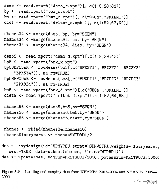图 5.9 显示了加载八个文件并合并它们的代码。函数merge()用于合并四个数据文件,然后rbind()用于将两个结果数据集垂直粘贴在一起(当然,在检查变量确实正确对齐之后)。 还需要计算变量bpxsar 和bpxdar,即多次血压测量的平均值,这些变量在2003-2004 年的数据中提供,但在2005-2006 年没有提供。