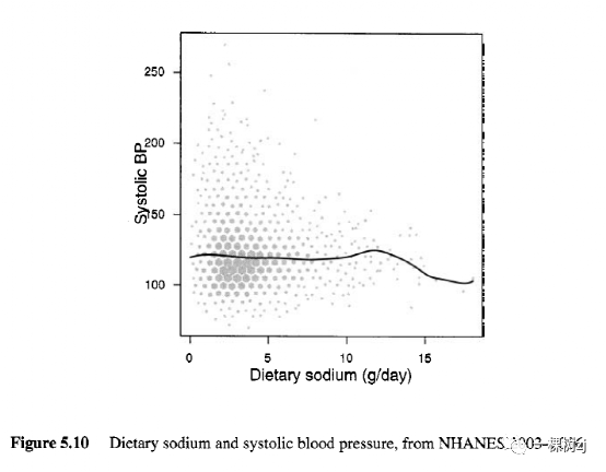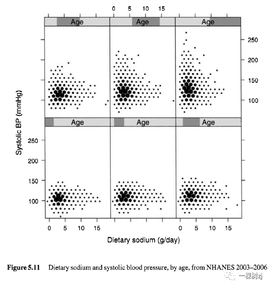 图 5.10 显示了收缩压和膳食钠数据,svysmooth() 生成了平滑的平均曲线。没有明确的关系,事实上,有迹象表明,随着钠摄入量的增加,血压会降低。回顾第 4 章中的血压和年龄图表,年龄很可能是一个重要的混杂因素。血压肯定会随着年龄的增长而升高,而且很可能不同年龄的人有不同的饮食习惯。图 5.11 显示了六个年龄组的血压与膳食钠之间的关系,现在有人建议增加,尤其是在年轻年龄组。