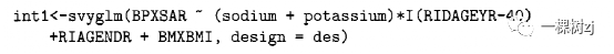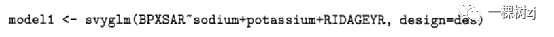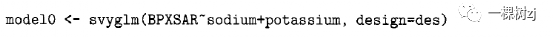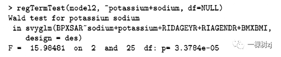 可以使用 regTermTest()计算钠和钾影响的组合测试,如下所示其中 df=NULL 给出了残差自由度的默认选择,在这种情况下是层数减去设计中的 PSU 数。