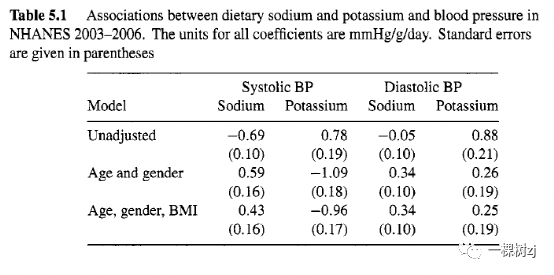 model1会逆转这种关联,钠的系数为 0.80,钾的系数为 -0.91,p 值小于 0.0001。其他重要的潜在混杂变量是性别 (RIAGENDR) 和一些肥胖的衡量指标,例如 BMI (BMXBMI)。表 5.1 显示了一系列模型中收缩压和舒张压的钠和钾系数。