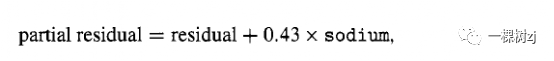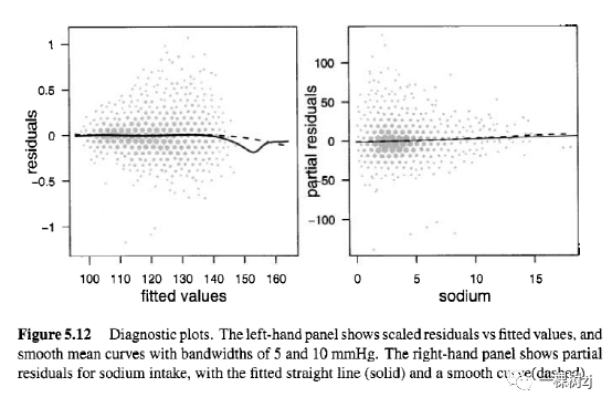 图 5.12 的左侧面板显示了收缩压最终模型的残差和拟合值,使用 svysmooth()估计了平滑的平均曲线。由于某些变量具有缺失值,因此有必要对调查设计对象进行子集化,以仅包含图形和平滑曲线的非缺失子群。模型对象有一个元素 na.action,它列出了由于缺失数据而被丢弃的观察数,因此des [-modellba.action,]是没有这些缺失值的设计子样本。拟合值中没有非线性的迹象,这可能表明混杂模型的指定错误。右侧面板显示了钠的偏残差。偏残差是通过将一个变量对残差的拟合贡献相加获得的,公式如下: