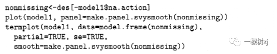 对于未加权的数据,可以使用 plot () 方法和 termplot ()函数。这些函数也适用于 svyglm() 拟合的模型,但默认情况下,它们拟合的平滑曲线不会使用采样权重。要使用 termplot()和 plot()带有抽样加权模型,可以提供一个加权平滑器来代替通常的未加权平滑器,