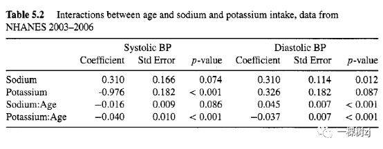 该模型添加了年龄与钠摄入量和钾摄入量之间的交互项。使用 ridageyr-40 的原因是年龄变量的零出现在有用年龄而不是零年龄。模型中的星号要求年龄的主效应和交互项。该模型中的系数和舒张压的类似系数在表 5.2 中给出。