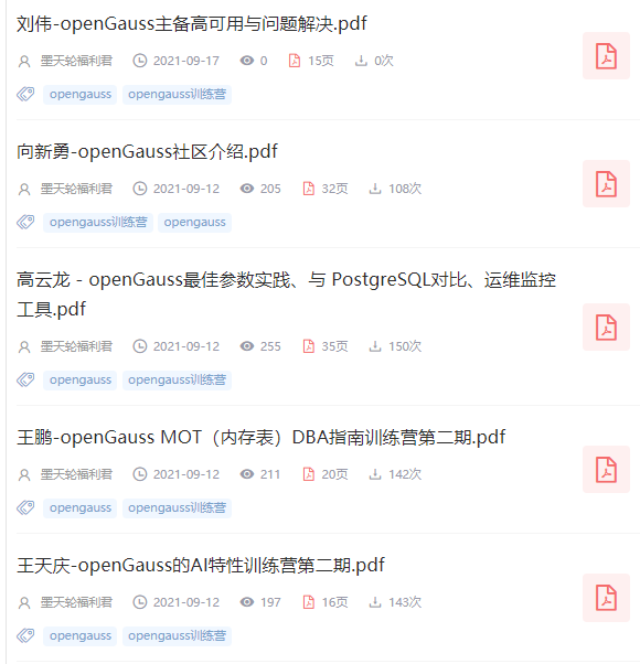 70、openGauss对Oracle语法的兼容达到了什么程度?例如Oracle的函数、存储过程中用到自定义type、自定义聚集函数、批处理语句、游标等,向openGauss迁移的时候还需要再做逻辑修改嘛?答:PPT里有介绍openGauss对函数的两种风格:Oracle风格和PG风格,更多兼容性可以参考如下链接(复制链接在浏览器中打开):https://gitee.com/enmotech/compat-tools71、openGauss的gs_dumpall和gs_dump命令都属于冷备份吗?答:支持hot_standby备库可读以及级联备份。73、gs_dump开并行,这个能保证一致性备份吗?答:一般情况不需要指定,通常建议服务器及客户端都采用UTF8编码,数据库客户端字符集如果不一致可以设置client_encoding参数。75、openGauss的gs_dumpall、gs_dump备份需要停库吗?76、openGauss支持类似Oracle的全局索引吗?77、openGauss中能实现类似Oracle自动内存管理吗?只需要设置max_process_memory值,其他如shared_buffers、work_mem会根据数据库运行情况自动调整。78、openGauss中有没有类似Oracle数据库中的profile,是怎么限制用户访问数据库时的资源使用的?79、单机和集群wal_level都是建议logical吗?对热备份有什么影响?答:logical只针对在有逻辑复制需求的情况下设置,对热备份没有影响。80、WAL日志如何解析成SQL,类似于Oracle Logmnr?81、WDR报告或者哪里能够看到类似Memory Advisory和其他参数的Advisory?答:max_replication_slots限制最大复制槽的数量,enable_slot_log控制集群内复制槽是否保持一致。83、openGauss不是单机数据库吗?sync_config_strategy这个参数有什么意义?答:可以是主备集群的,sync_config_strategy针对主库和备库之间参数是否要同步。84、enable_wdr_snapshot打开后,如果不想每小时采集一次,怎么调整采集的时间间隔?答:参数wdr_snapshot_interval控制。85、为什么会把wal_keep_segments和checkpoint_segments都设置为1024,一般来说不应该wal_keep_segments更大,检查点checkpoint应该更小一些吗?答:这两个参数之间没有明确的关联关系,一个是wal保留的最少数量,一个是checkpoint触发条件。86、Switchover和MySQL Failover机制一样吗?答:Switchover是主备角色切换,且数据不丢失;Failover更多的考虑的是主库故障,将备库提升为主库,有丢失的可能性。87、监控工具postresql_exporter和opengauss_exporter的区别,它们的特点是什么?答:opengauss_exporter是对postresql_exporter代码逻辑重构,并增加了支持集群监控,多实例监控,多数据库监控,监控缓存等特性。答:pg_settings视图中有context字段,也可以看官方文档。90、openguess_exporter对数据库有多大侵入性?答:opengauss_exporter可以同时支持MD5和SHA256。92、监控组件如Prometheus+Grafana安装是和数据库一起安装,还是需要单独安装?93、如果备库没挂,但是备库写入很慢影响了主库效率,这时候可以自动忽略备库吗?答:备库端涉及:接收日志到缓存一个,从缓存刷出磁盘一个,读磁盘一个,分发redo一个,分发执行者并行8(可配置)。答:最快速模式下,是无法保证的,因此禁读,正常情况下,是表级别并行。96、目前openGauss主备集群支持读写分离、负载迁移吗?如果支持,具体是什么组件在负责?备库支持临时转换成可读可写的快照库吗?若备库支持可读写转换,可否从读写状态再切回正常的只读复制状态?答:读写分离通过ShardingSphere,pgpool均可支持,不支持快照库,也不支持从读写状态再切回只读复制状态(在保证全局禁写的情况下主库才可以切换为备库)。97、openGuess的高可用是在主备库同步基础上搭建的吗?后期会有类似Oracle RAC架构的吗?98、高可用类似MySQL复制?有办法拥有VIP么?答:高可用如在MogHA(云和恩墨产品,其他方案也是类似思路)中,是类似MHA的处理,通过VIP保证切换和访问。答:高可用通过WAL复制的高安全级别比方on,remote write等保证。