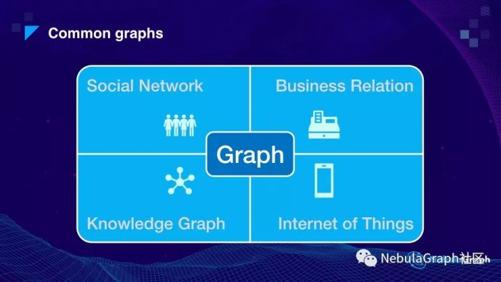 第一个 Social Network(社交网路),比如说微信或者 Facebook 好友关系等等。这个网络有几十亿个用户,几千亿到几万亿的连接关系。第二个 Business Relation,商业的关系,常见的有两种网络: