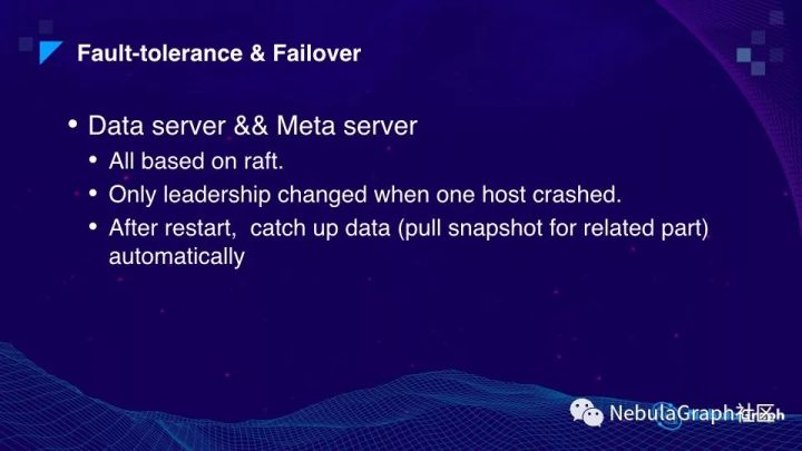 Nebula 对于容错或者说高可用的保证,主要依赖于 Raft 协议。这样单机 Crash 对服务是没有影响的,因为用了 3 副本。那要是 Meta Server 挂了,也不会像 HDFS 的 NameNode 挂了影响那么大,这时只是不能新建 schema,但是数据读写没有影响,这样做 meta 的迁移或者扩容也比较方便。