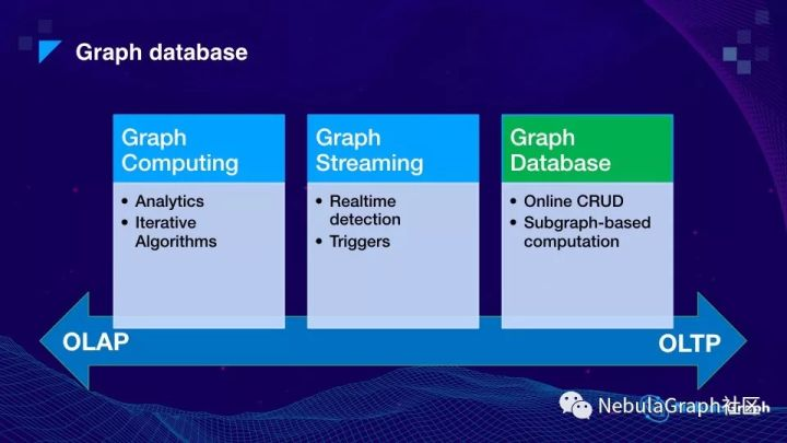 对于图计算或者图数据库本身我们是这么理解的,它跟传统数据库很类似,也分为 OLAP 和 OLTP 两个方向。
