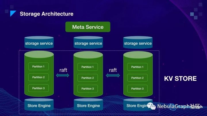 这张图其实是前面整体架构图的下面部分。纵向可理解为一台机器,每台机器最上面是 Storage service,绿色的桶是数据存储,数据被切分成很多个分片 partition,3 台机器上同 id 的 partition 组成一个 group,每个 group 内用 Raft 协议实现多副本一致性。Partition 的数据最后落在 Store Engine 上,Nebula 默认 Store Engine 是 RocksDB。这里再提一下,partition 是个逻辑概念,partition 数量多少不会额外增加内存,所以一般把 partition 数量设置成远大于机器的数量。