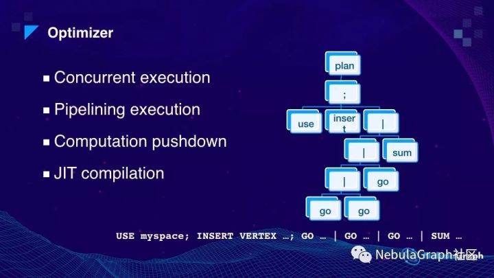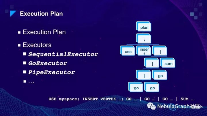 这里有个小例子展示了执行计划,下方就是一条语句。首先 use myspace,这里的 space 和数据库里的 database 是一个概念,每个 space 是一个物理隔离的空间,可用来区分敏感数据和非敏感数据,或者说做多租户的支持。分号后面是下一语句—— INSERT VERTEX 插入节点, GO 是网络拓展, | 为 Nebula 的管道用法,这条语句的意思是将第一条 Go 的结果传给第二条 Go,然后再传给第三条,即往外走三步遍历,最后把整个结果做求和运算。这是一种常见的写法,Nebula 还支持其他写法。