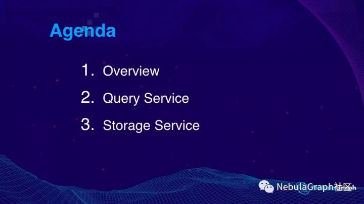 这个就是 Nebula。先从 overview 介绍图数据库到底是个什么东西,然后讲我们对图数据库的一些思考。最后具体介绍两个模块, Nebula 的 Query Service 和 Storage Service。后面两部分会稍微偏技术一些,在这个过程当中如果大家遇到什么问题,欢迎随时提出。