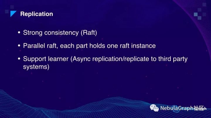 最后再谈下数据多副本和 Failover 的问题。前面已经提到多副本间是基于 Raft 协议的数据强一致。Nebula 在 Raft 做了些改进,比如,每组 partition 的 leader 都是打散的,这样才可以在多台机器并发操作。此外还增加了 Raft learner 的角色,这个角色不会参与 Raft 协议的投票,只负责从 leader 读数据。这个主要应用于一个数据中心向另外一个数据中心做异步复制场景,也可用于复制到另外第三方存储引擎,比如:HBase。