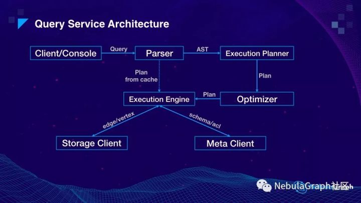 再来介绍下查询引擎的架构,从查询引擎的架构图上来看,和数据库类似:从客户端发起一个请求(statement),然后 Parser 做词法分析,之后把分析结果传给执行计划(Execution Planner),执行计划会基于这个语句的特点,交给优化器(Optimizer)进行优化,最后将结果交给执行引擎(Execution Engine)去执行。执行引擎会通过 MetaService 获取点和边的 schema,通过存储引擎层获取点和边的数据。