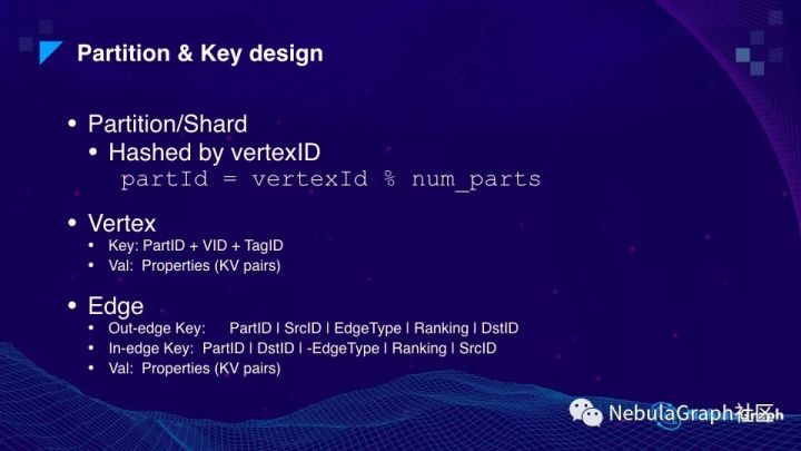 这一页是 schema,讲的是怎么把图数据变成 KV 存储。这里面的第一个概念是标签(Tag),“标签”表示的是点(Vertex)的类型,一个点可以有多种“标签”或者说“类型”。另一个概念是边类型(Edge Type),一条边需要用起点 ID,终点 ID,边类型和 Ranking 来唯一标识。前面几个字段比较好理解,Ranking 这个字段是留给客户表示额外信息,比如:转账时间。这里补充下说明下 Nebula 顶点 Vertex、标签 Tag、边 Edge、边类型 Edge Type的关系。