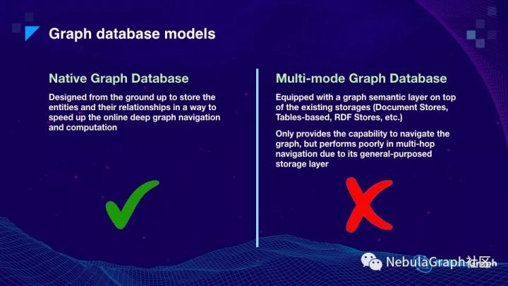 说完技术挑战,还有个概念我想特别澄清下。大家如果网上搜图数据库,可能有 20 个自称图数据库的产品。我认为这些产品可以分成两类,一种就是原生的,还有一类是多模的。