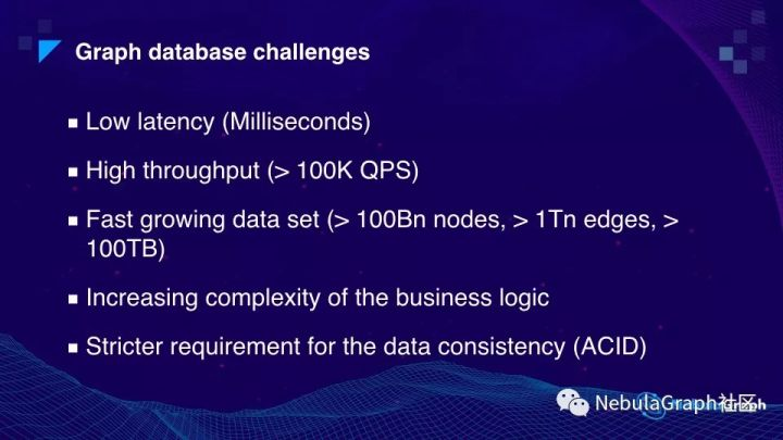 第三个挑战是数据量激增,数据量的增加速度快于硬件特别是硬盘的增长速度,这个给 DB 带来了很大的挑战。大家可能用过一些单机版的图数据库,刚开始用觉得不错,能满足需求。但一两年后,发现数据量增加太快,单机版已经完全满足不了需求,这时总不能把业务流控吧。