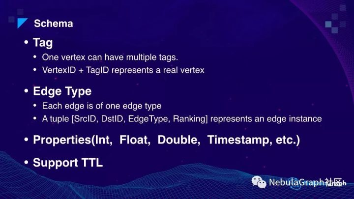 上面例子中,点和边都带有属性,即多组<k,v>。Nebula是一个强 schema 系统,属性的每个字段名和对应的类型需要在构图时先定义,和数据库中的 alter table 类似 Nebula 也支持你在后续操作中进行 Schema 更改。Schema 中还有常见的 TTL(Time To Live),指定特定数据的生命周期,数据时效到后这条数据会被自动清理。