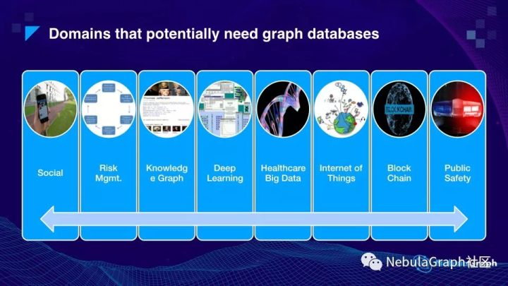 第三个是知识图谱,也是最近比较热的一个领域。在各个垂直领域会有不同的知识点,且知识点之间有相关性。部分垂直领域知识的网络至少有几百亿条关系,比如银行、公安还有医学领域。