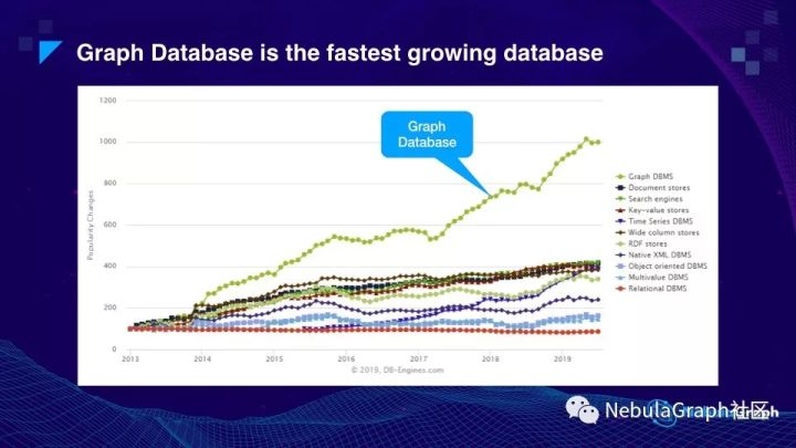 可以看到在过去六年多的时间里,图数据库的整个趋势,或者说它的影响力大概增长了十倍。