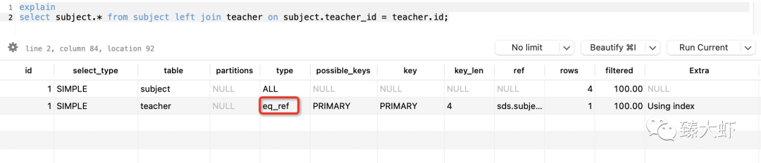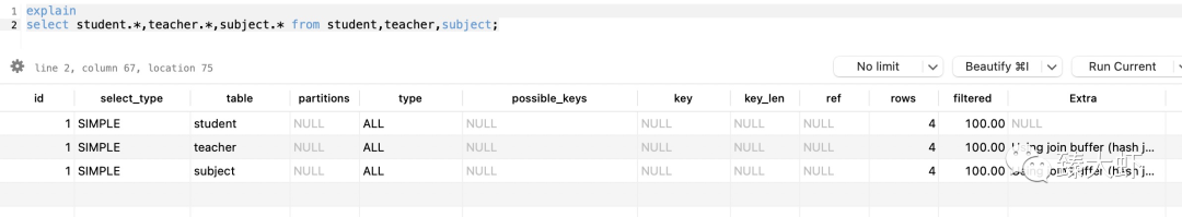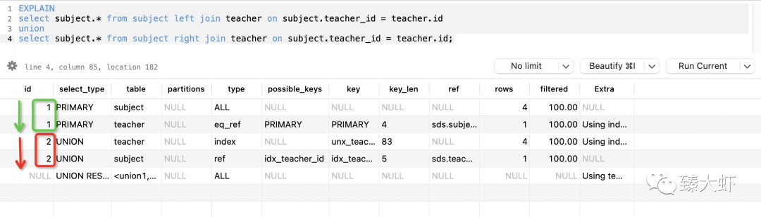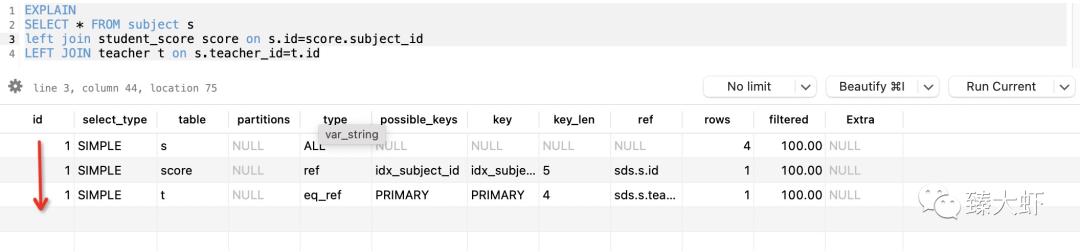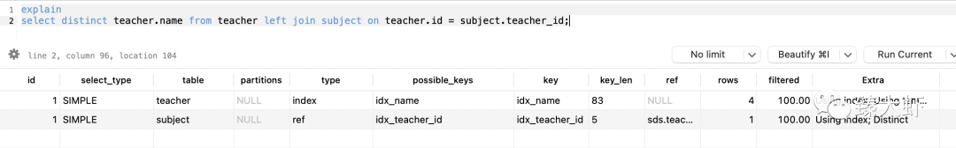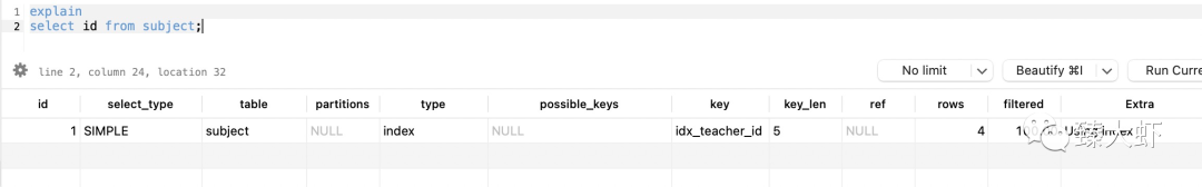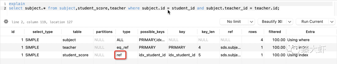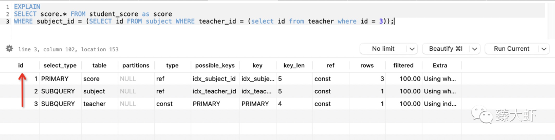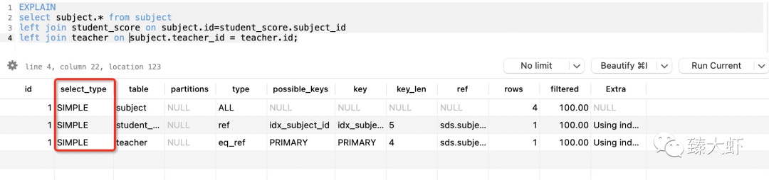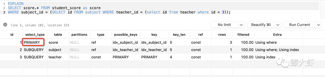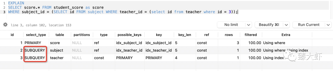 在 where 或 select 中包含子查询,那查询就会称为 SUBQUERY,如这里的 subject 和 teacher